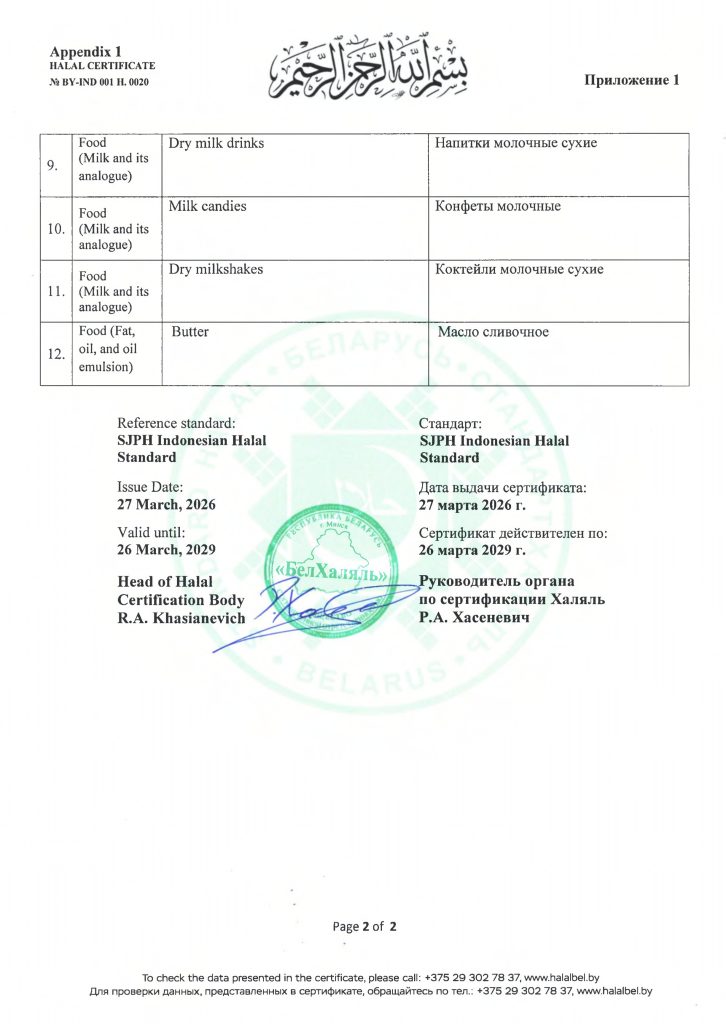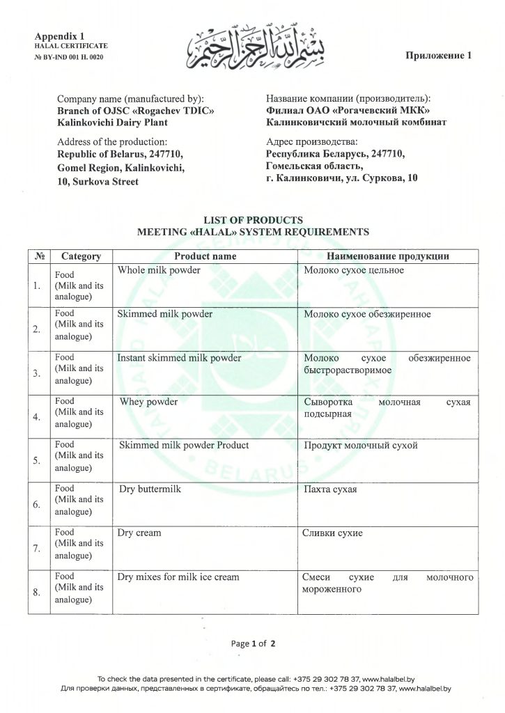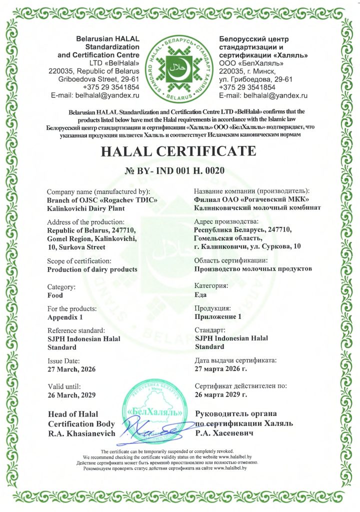 В связи с расширением рынков сбыта и привлечением новых покупателей с 2018 года на филиале ОАО «Рогачёвский МКК» Калинковичский молочный комбинат внедрена система добровольной сертификации по канонам Ислама – система «Халяль» («Halal»), которая позволяет обеспечить соответствие продукции нормам Шариата и пригодность для потребителей стран мусульманского мира.